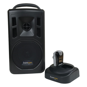 Lyrik Wireless Portable Sound System including tower speaker with battery, teacher pendant mic, drop-in charger, and power supplies.